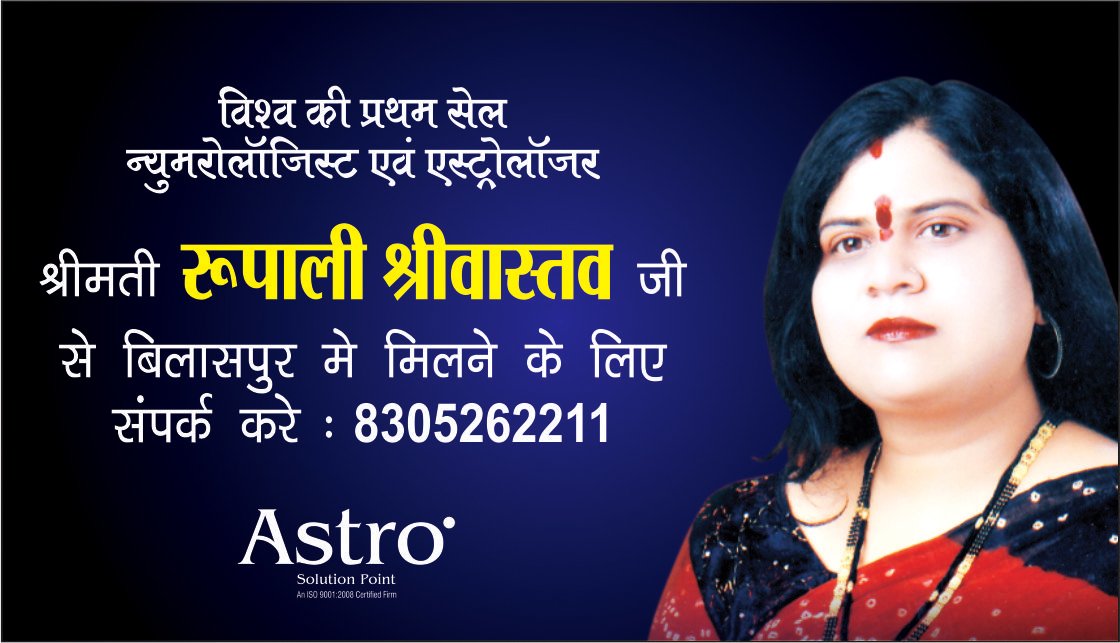 13 और 14 अप्रैल 2022 Astrologer & Cellnumerologer ज्योतिष एवं वास्तु विद रूपाली श्रीवास्तव BILASPUR में उपलब्ध । मिलने के लिये संपर्क करें 8305262211